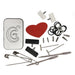 Cette petite boîte en métal ChiaGoo contient des connecteurs de câbles (4), des bouchons (4), des clés de serrage (2), des aiguilles à repriser (2), des adaptateurs [L] - [S] (2), des marqueurs de points (20), des épingles de sûreté (2) et une pince en caoutchouc en forme de cœur.