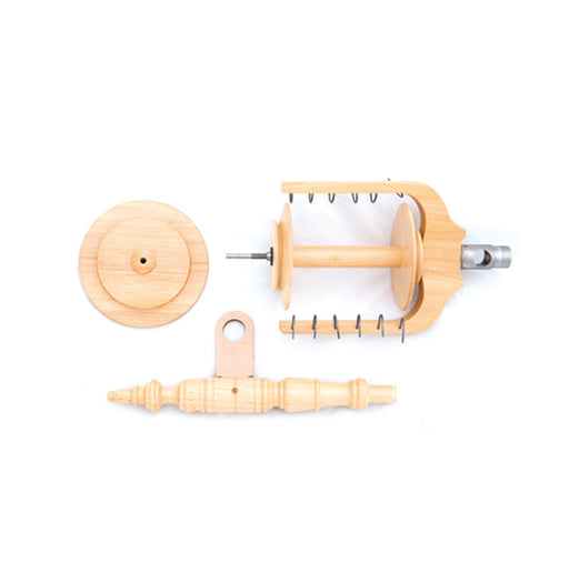 Commonly supplied with a dedicated arched lazy kate; add standard/jumbo bobbins, flyers (standard/jumbo), extra whorls/ratios, orifice reducers, drive bands, and parts. The Jumbo flyer set features a ~0.70" orifice with slower whorl options (e.g., 5.1:1 and 7.2:1) for bulky spinning and plying.
