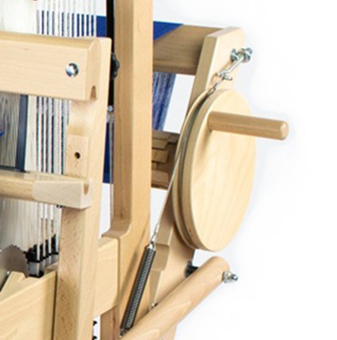 The warp beam is equipped with a friction brake, allowing you to advance the warp without leaving your bench. The beater is height- and level-adjustable for ergonomic weaving and comes with an integrated shuttle race and shelf.