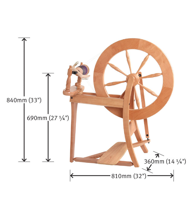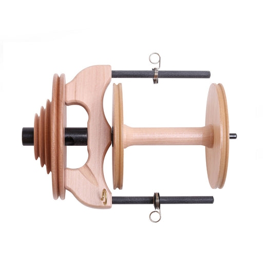 Ball bearings and large 56cm (22ins) wheel makes treadling smooth and effortless and easy to maintain a steady speed. The wide legs give good stability especially when speed spinning. The treadle is pivoted to allow a comfortable heel-toe action. Lazy Kate and 4 bobbins included. The many optional accessories make this an extremely versatile wheel.