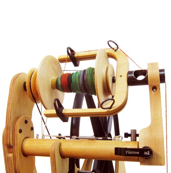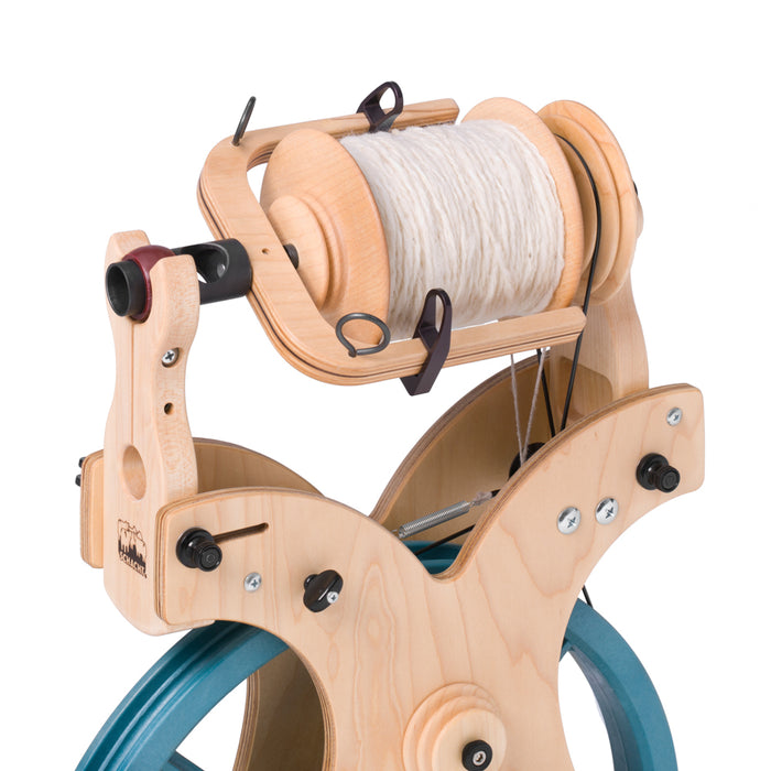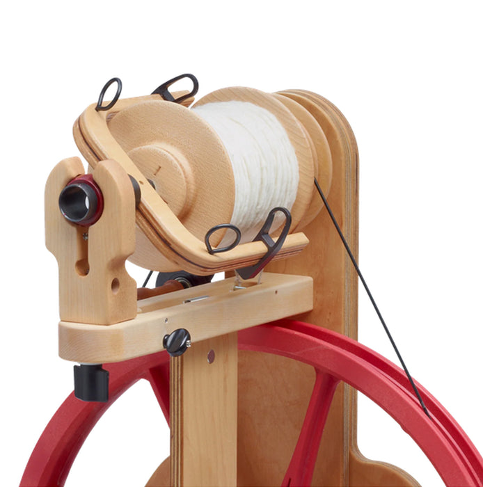 Les bobines à grande capacité s'adaptent également au cantre (Lazy Kate) à tension et à celui qui s'adapte sur le rouet Ladybug. Les ratios ne sont pas modifiés avec cet épinglier.